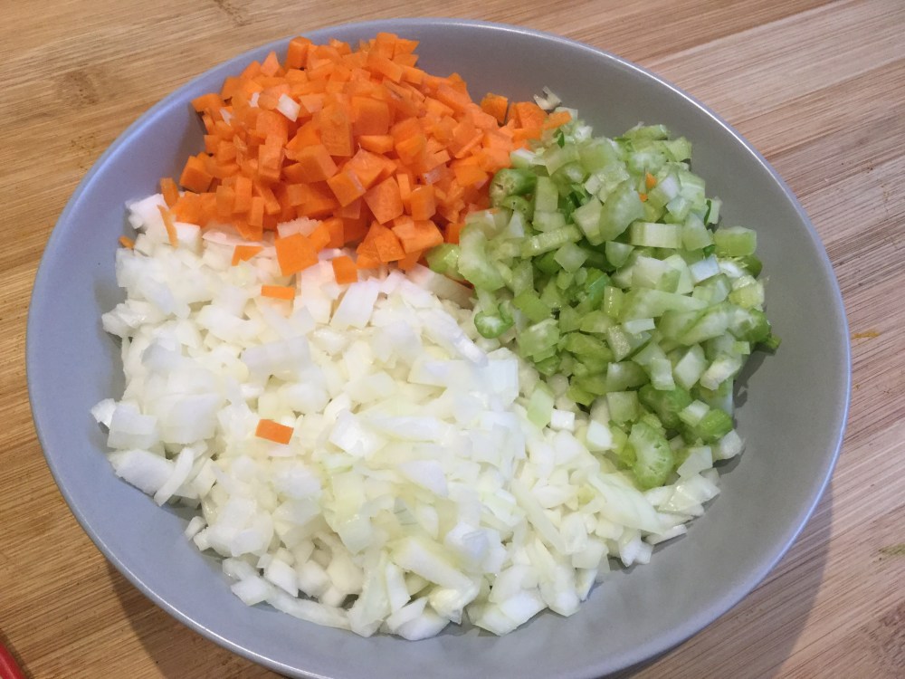 - 油を鍋に温めて、玉ねぎ、ニンジンとセロリを入れ、中火に十分ほどで炒める。