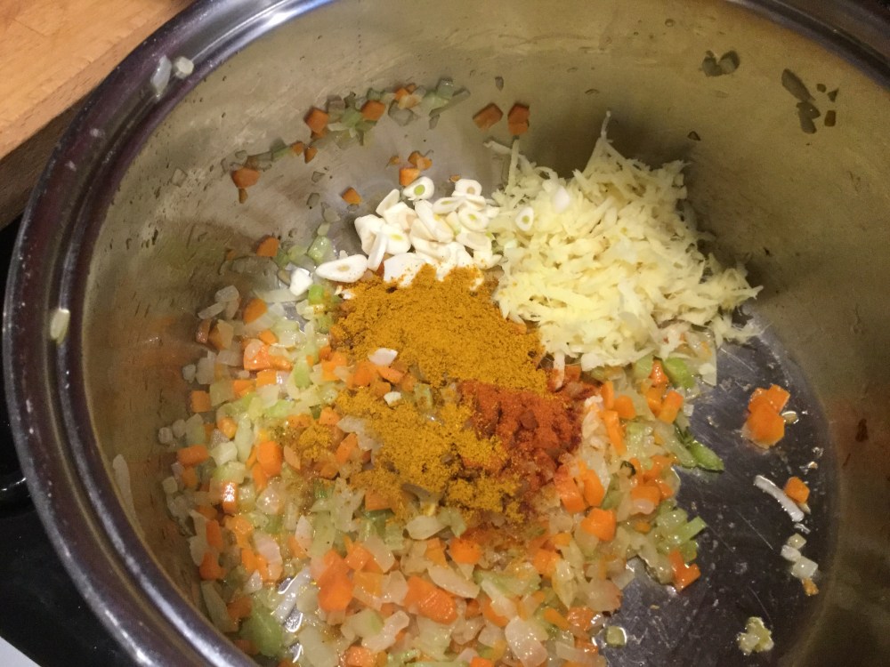 - ニンニク、生姜、カレー粉とカイエンペッパーを鍋に加え、1-2分混ぜながら炒める。