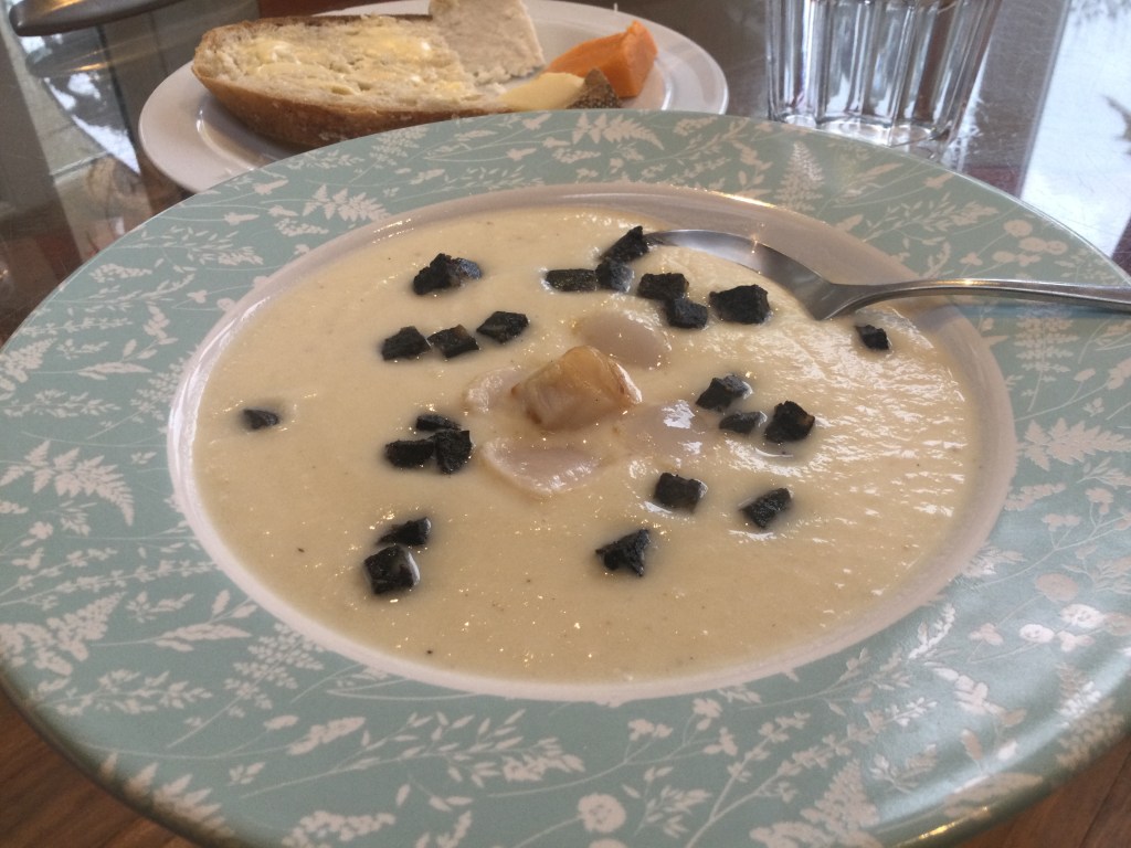 このスープは作りやすいです。ブラックプディングはこってりしてそれがクリーミーなセルリアックを引き立てる。ホタテガイの代わりにエビとかも使えます。