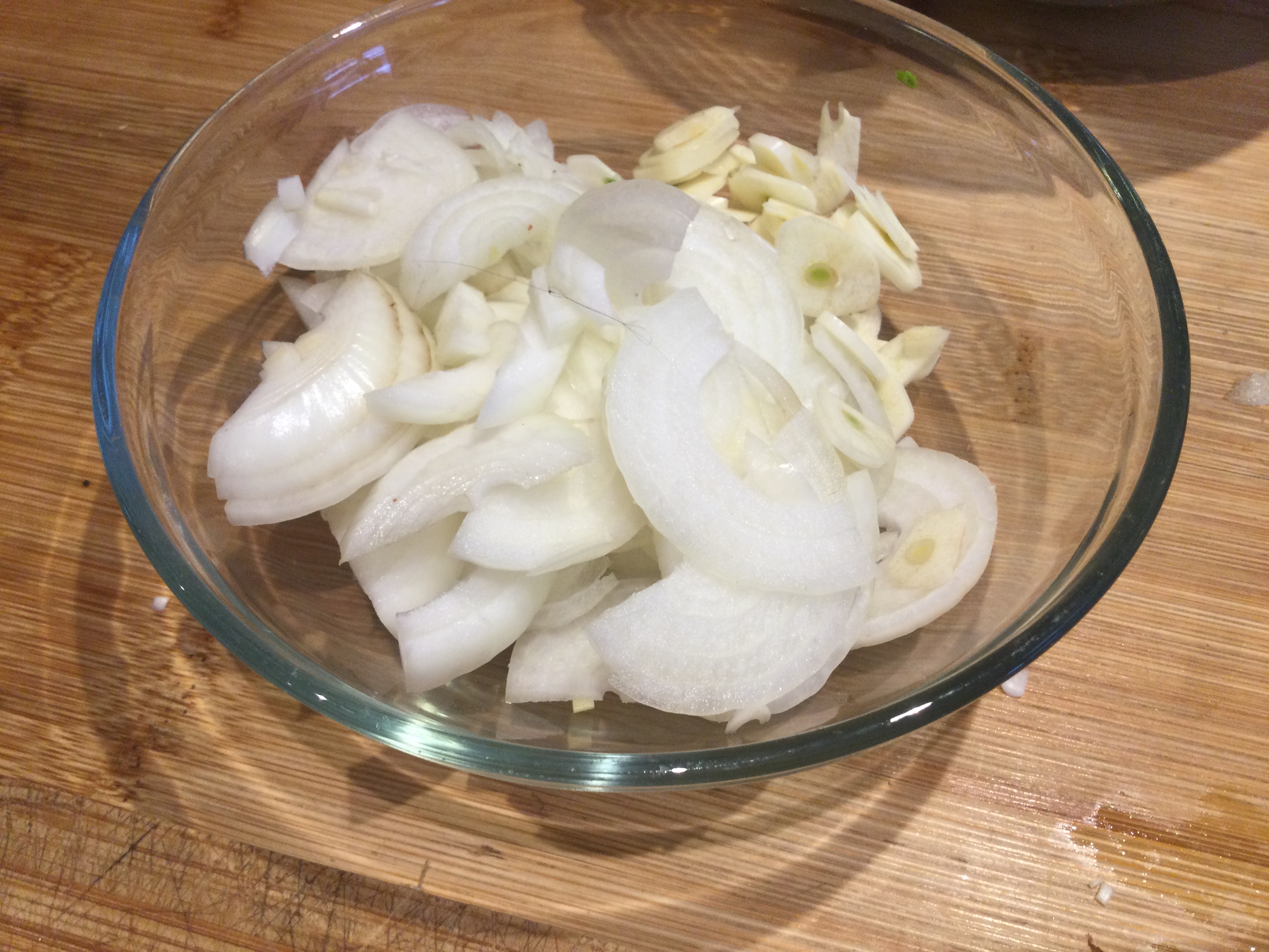 - 玉ねぎとニンニクをスライスする。