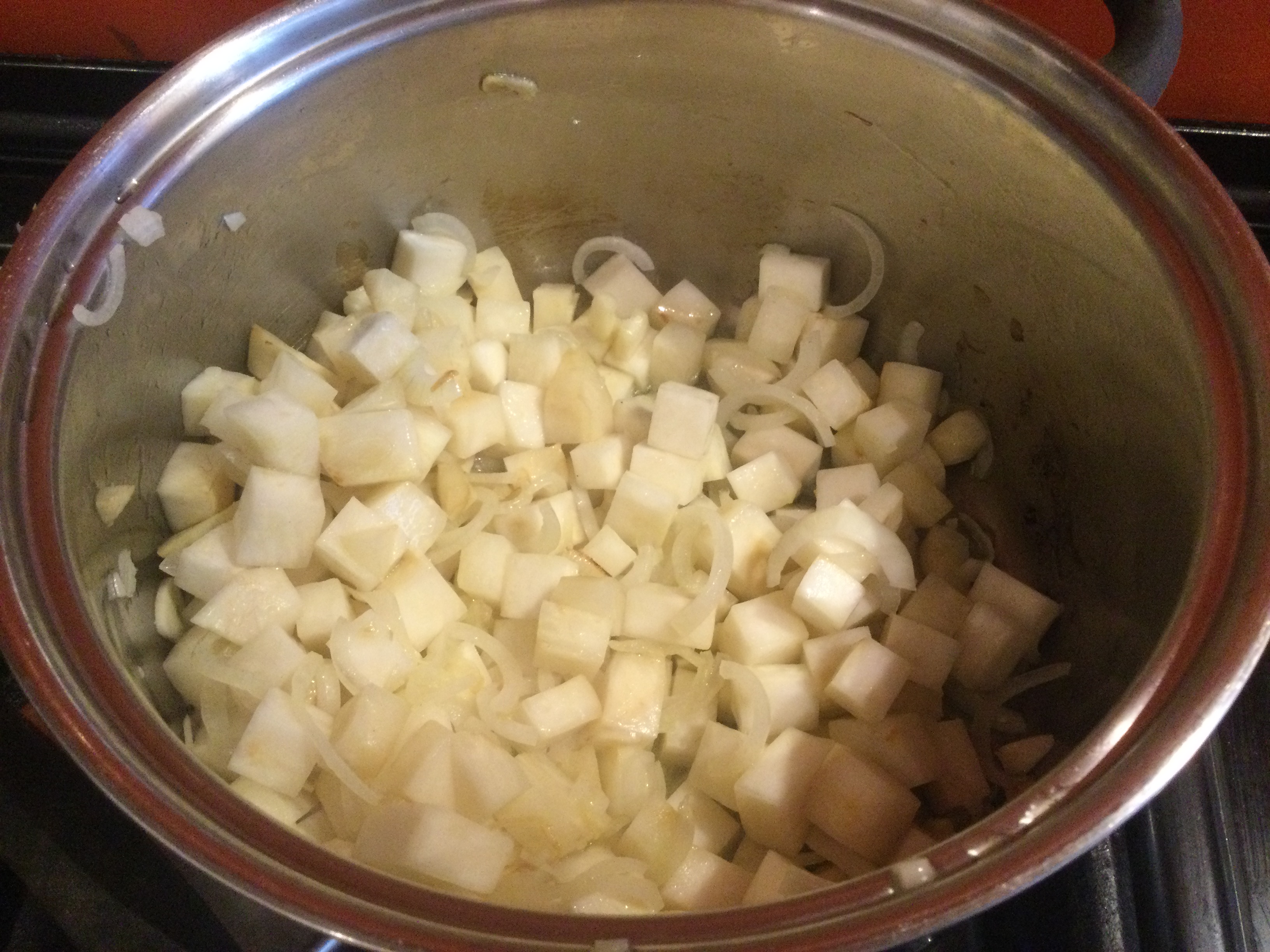 - セルリアック、玉ねぎ、ニンニクを鍋入れ、中火で5-10分焼く。