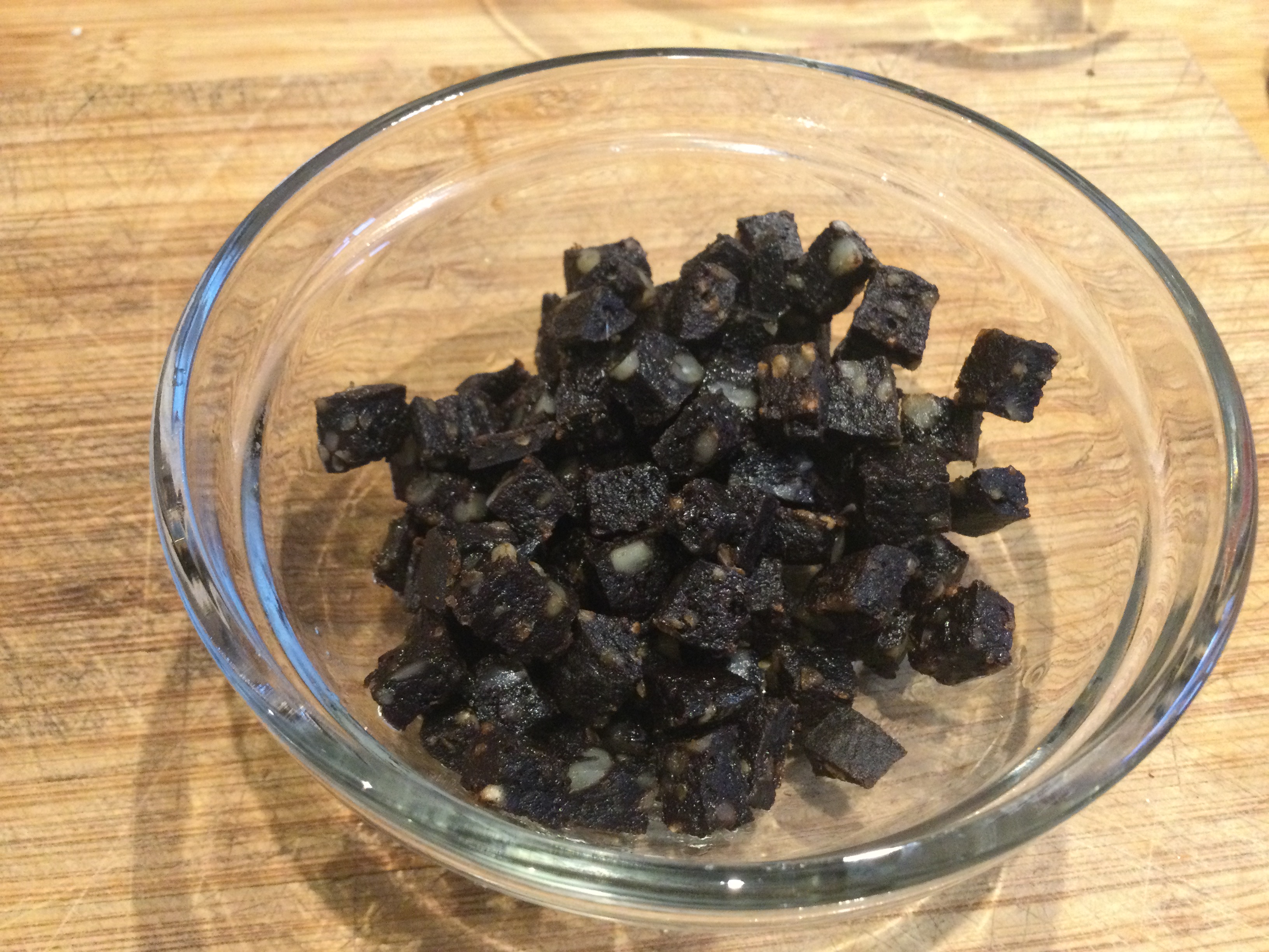 - ブラックフプディングは皮をむいてさいの目に切る。