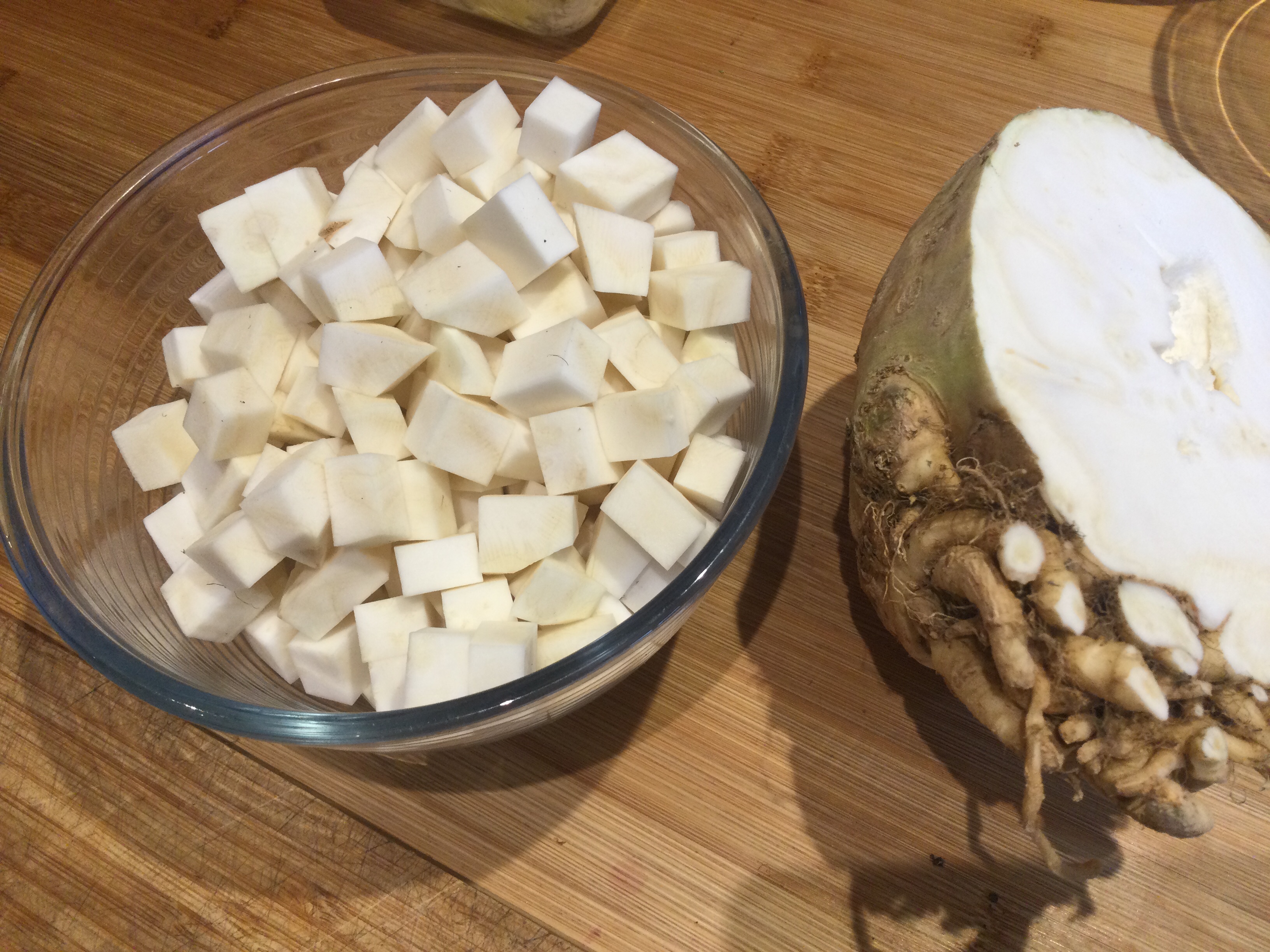 - セルリアックは皮をむいてさいの目に切る。